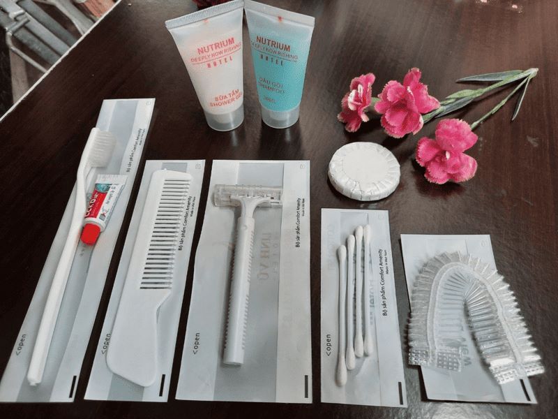 - Đa dạng sản phẩm: Bộ amenities thường bao gồm bàn chải, kem đánh răng, lược, chụp tóc, tăm bông, xà bông, dầu gội, sữa tắm,... Một số nơi trang bị thêm bộ kim chỉ, bông tẩy trang, thun buộc tóc, xơ mướp tắm, muối tắm,...