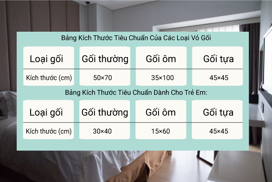 Bảng kích thước tiêu chuẩn của các loại vỏ gối: (xem hình bên dưới)