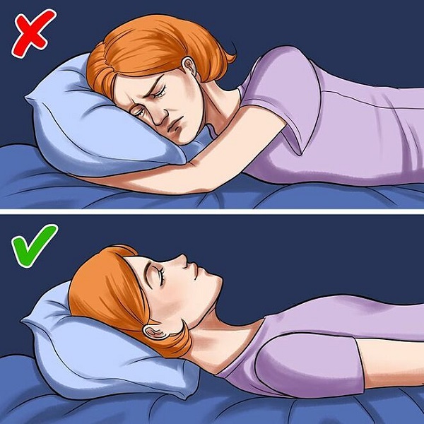 Nếu bạn nằm ngửa khi ngủ, hãy cố gắng giữ cánh tay của bạn ở vị trí giống vậy. Ví dụ, để cả hai bên nghiêng sẽ tốt hơn là đưa tay lên trán. Vì điều đó tạo ra sự bất hòa cột sống, có thể dẫn đến đau vai hoặc cổ.
