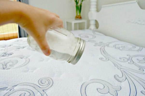 Bạn có thể đổ 1 lớp phấn rôm mỏng lên mặt nệm. Sau đó, xoa nhẹ sao cho lớp phấn ngấm vào đệm. Phấn rôm sẽ khử mùi, đồng thời hút ẩm hiệu quả.