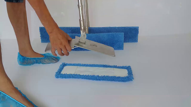 - Đầu tiên, bạn cần lắp phần giẻ lau vào đế inox bằng cách dập nhẹ phần đế và chốt khóa đế lại. Bạn cũng cần chuẩn bị thêm một vài tấm lau nhà san hô khác để thay thế trong quá trình làm sạch sàn nhà.