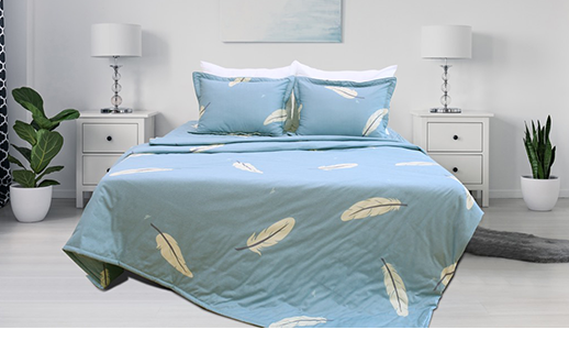 - Đặc điểm: Bộ chăn ga gối với họa tiết lông vũ nhẹ nhành trên nền xanh tạo sự nổi bật cho phòng ngủ. Sản phẩm mang đến một phong cách thật trẻ trung phù hợp với mọi lứa tuổi.