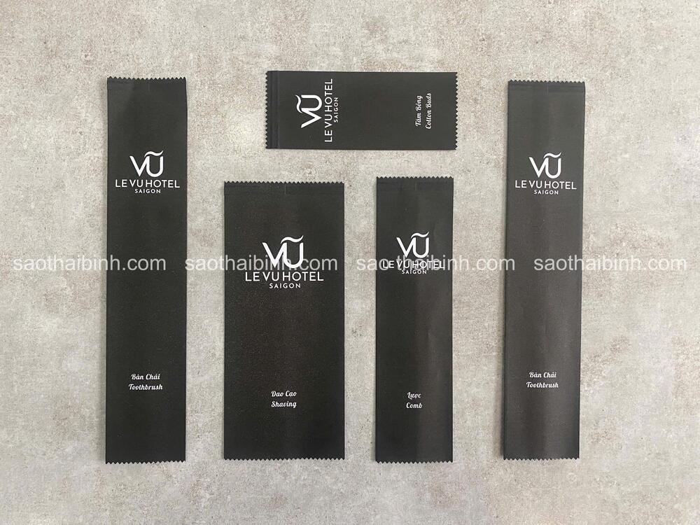 Trong dự án hợp tác cùng Sao Thái Bình, Le Vu Hotel lựa chọn tone trắng của túi giấy nến, phối hợp logo màu vàng.