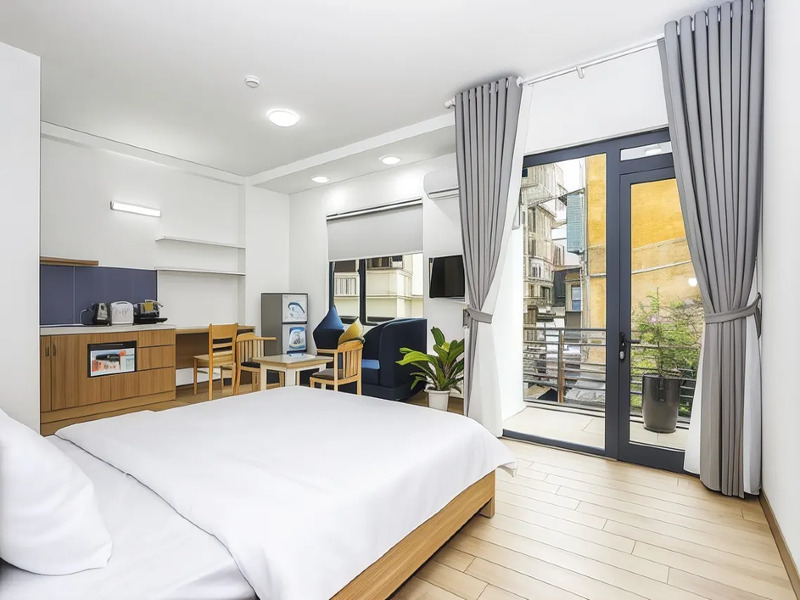 - Studio tiêu chuẩn với 1 giường king, tủ quần áo, tủ đầu giường, tủ lạnh, bàn trà, ghế sofa, bếp.