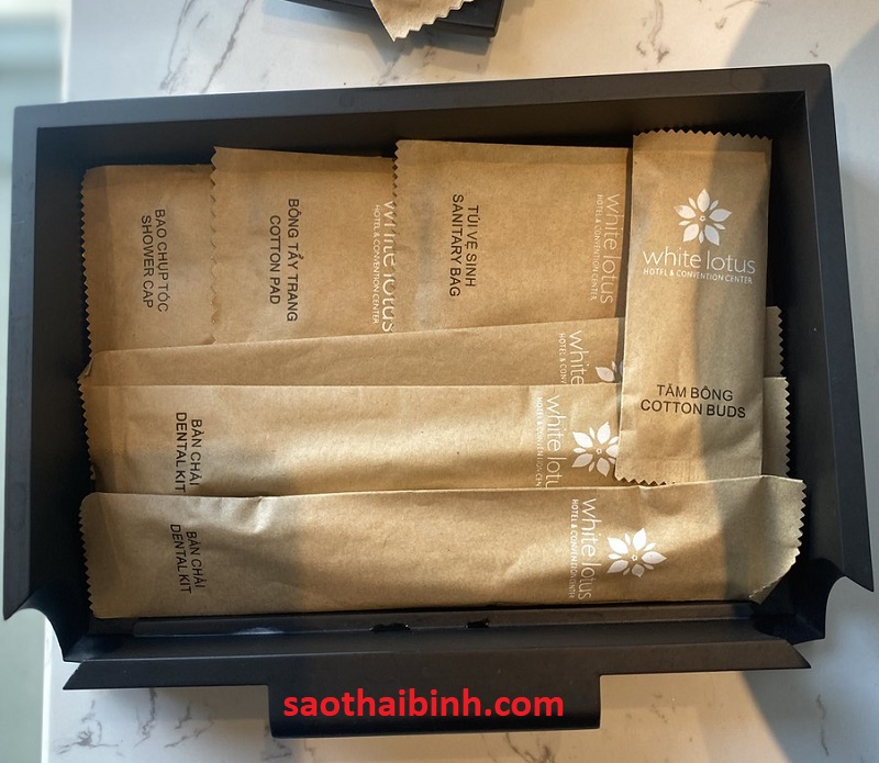 Những vật dụng trong nhà tắm sẽ được xếp gọn gàng trong khay đựng và để trên bàn đá hoặc là bồn rửa mặt hay những vị trí có thể dễ nhìn thấy. Các vật dụng còn lại sẽ được để vào túi riêng, hộp đựng, hoặc bao bì có in logo và tên khách sạn nhằm thể hiện sự chuyên nghiệp và quảng bá thương hiệu khách sạn qua những chi tiết nhỏ nhất.