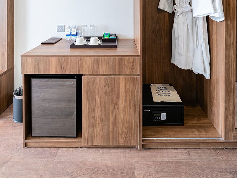 - Bộ amenities phòng ngủ (ấm siêu tốc, ly, bộ trà, két sắt, tủ minibar).