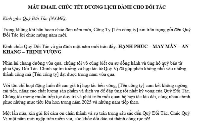 - Nhân dịp Tết Dương lịch 2026, [Tên doanh nghiệp] xin gửi lời chúc mừng năm mới chân thành nhất tới Quý đối tác và toàn thể đội ngũ. Chúng tôi đánh giá cao mối quan hệ hợp tác chiến lược mà hai bên đã xây dựng trong năm vừa qua. Bước sang năm mới, chúng tôi hy vọng sẽ tiếp tục củng cố và mở rộng hợp tác, cùng nhau tạo ra nhiều giá trị bền vững, nâng tầm hiệu quả và đạt những mục tiêu mới. Chúc Quý đối tác một năm mới thịnh vượng, an khang và gặt hái nhiều thành công lớn!