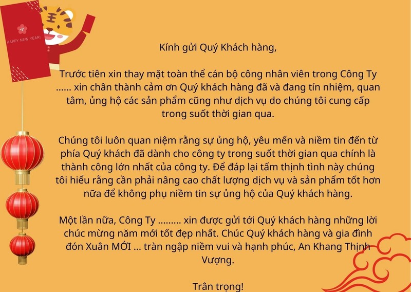 - Cảm ơn Quý khách đã luôn dành sự tin tưởng và ủng hộ cho [Tên doanh nghiệp] trong thời gian qua. Sự đồng hành của Quý khách là niềm tự hào và là động lực để chúng tôi không ngừng hoàn thiện mỗi ngày. Kính chúc Quý khách và gia đình một năm mới bình an, tràn đầy sức khỏe, thành công và hạnh phúc!