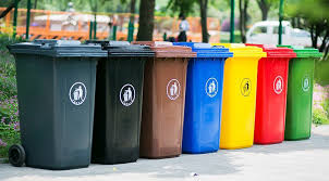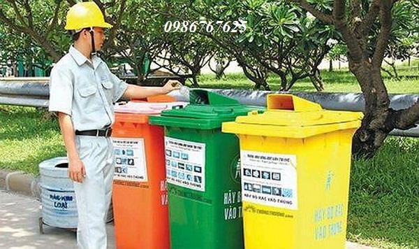 - Thùng rác nhựa có nắp đậy với 5 màu sắc chủ đạo: cam - xanh lá - đen - xanh da trời để phân biệt từng loại rác thải