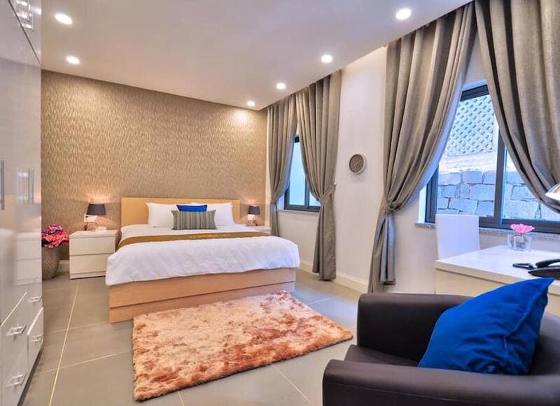 Phong cách thiết kế của Malibu Hotel mang hướng châu Âu sang trọng và đẳng cấp. Các đường nét được điêu khắc tỉ mỉ và sử dụng vật liệu đá hoa cương nhiều giúp căn phòng trở nên sáng bừng sức sống.
